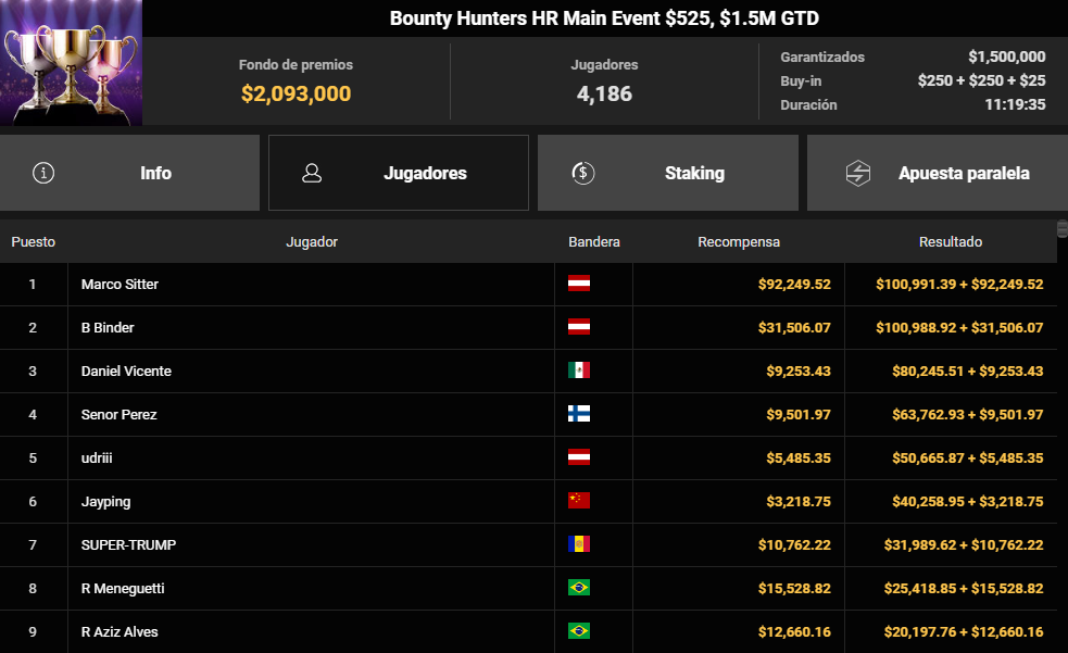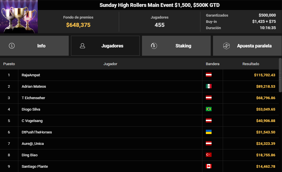 En paralelo, Adrián Mateos volvió a estar bajo los focos en el Sunday High Rollers Main Event de 1.500 $, un torneo con 455 jugadores y más de 648.000 $ de prize pool. El madrileño alcanzó el heads-up y terminó 2.º clasificado por 89.218 $, solo superado por un hasta ahora desconocido 'RajaAmpat', que celebró su victoria con un premio de 115.702 $.