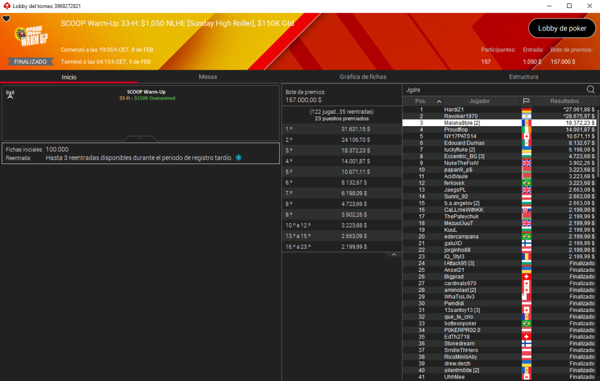 En PokerStars, donde se están jugando los eventos Warm-Up de las SCOOP, la bandera española también ondeó en el podio, aunque lamentablemente no lo hizo en lo más alto. Juan Pardo 'Malaka$tyle' terminó tercero en el SCOOP Warm-Up 33-H Sunday HR de 1.050 $, consiguiendo un premio de 18.372 $, que sirvió para dejar la cuenta de cobros españoles en 217.782 $.