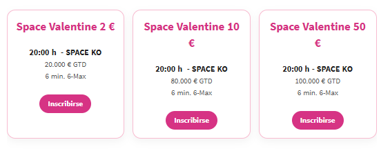 Este sábado, San Valentín, han programado tres torneos Space KO de 2 €, 10 € y 50 € con un garantizado global de 200.000 €. Son los Space Valentín: