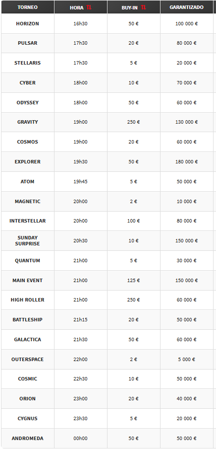 El sábado tres Space Valentine de 2 €, 10 € y 50 € con 200.000 € GTD y el domingo un Sunday Surprise con un viaje a Islandia para el ganador y un festival Space Sunday con 1.500.000 € GTD. ¡Te unes?
