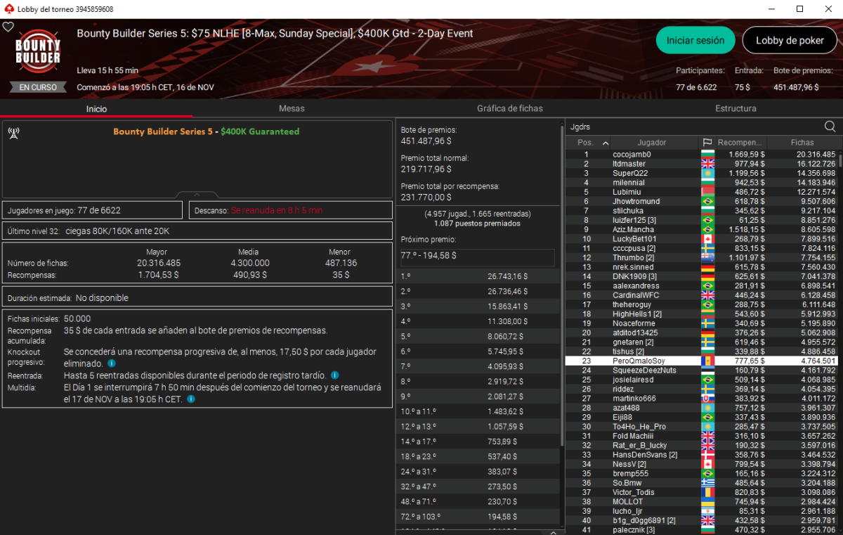 Con 4.764.501 puntos, 777.65 $ acumulados en recompensas y estando ya en ITM, regresará al Día 2 para pelear un torneo que cerró el registro con 6.622 entradas y que reparte 451.488 $ en premios con 26.743 $ más bounties reservados para el campeón.