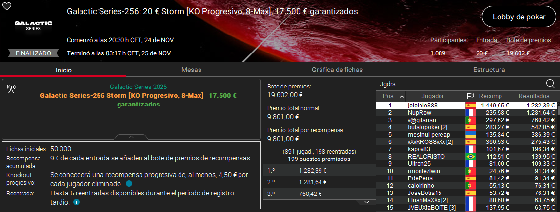 La única victoria española de la última jornada fue la que consiguió jolololo888 en el Galctic Series-256 Storm, de 20 € de entrada.