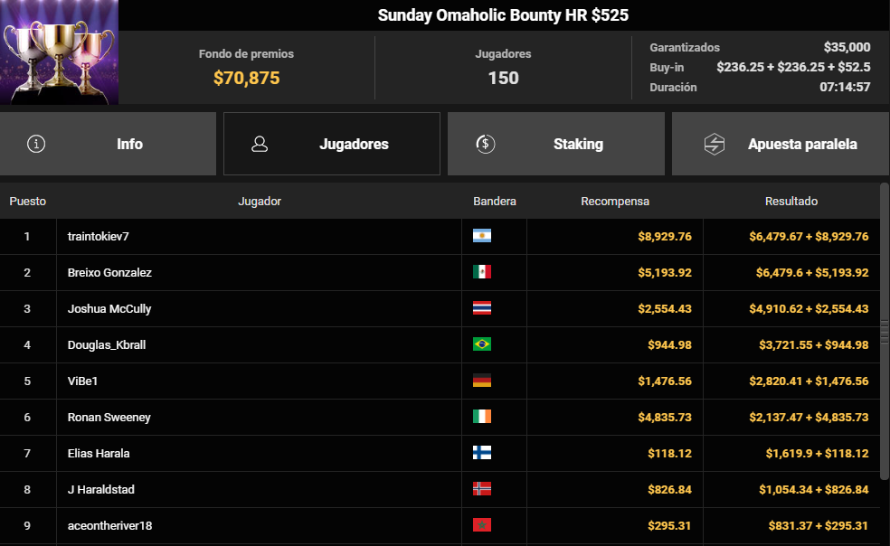 Con cuatro cartas también tuvimos un nombre destacado: Breixo González fue protagonista en el Sunday Omaholic Bounty HR $525, donde terminó segundo para un cobro total de 11.674 $, combinando premio regular y recompensas en un field de 150 jugadores. La victoria voló hasta Argentina de manos de 'traintokiev7', que se llevó 15.409 $.