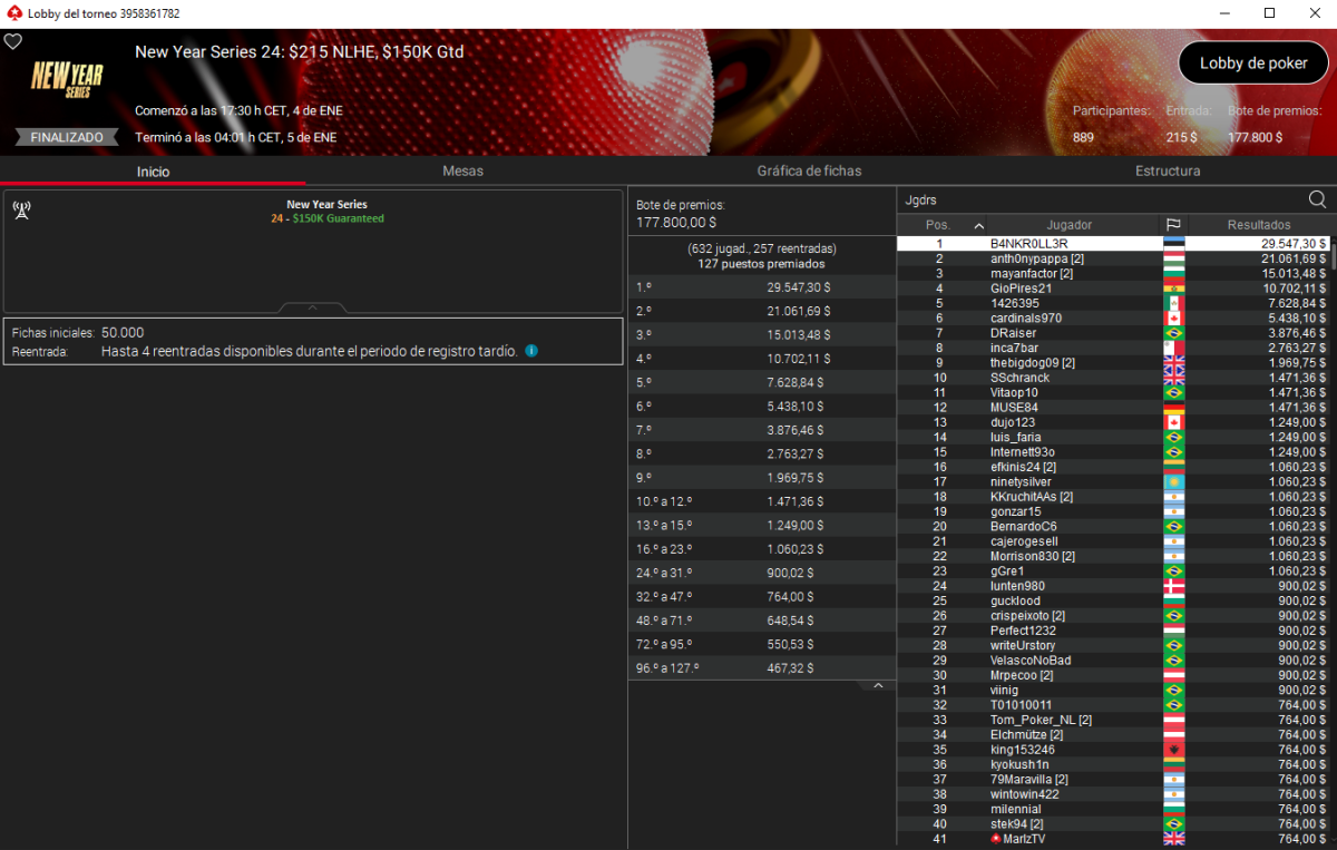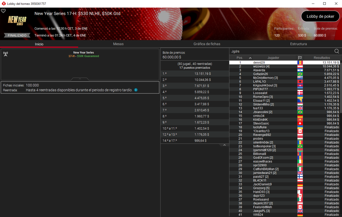 Por último, deivid29 también se sumó a la lista de campeones españoles con un primer puesto en el New Year Series 17-H – $530 NLHE de PokerStars, superando a un field de 120 entradas para cobrar 13.151 $ y redondear un fin de semana especialmente productivo.