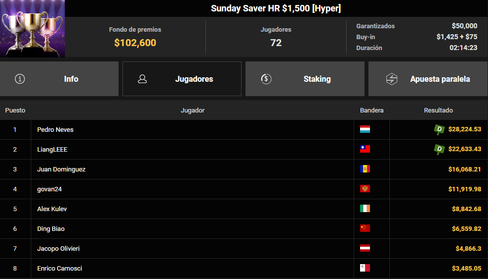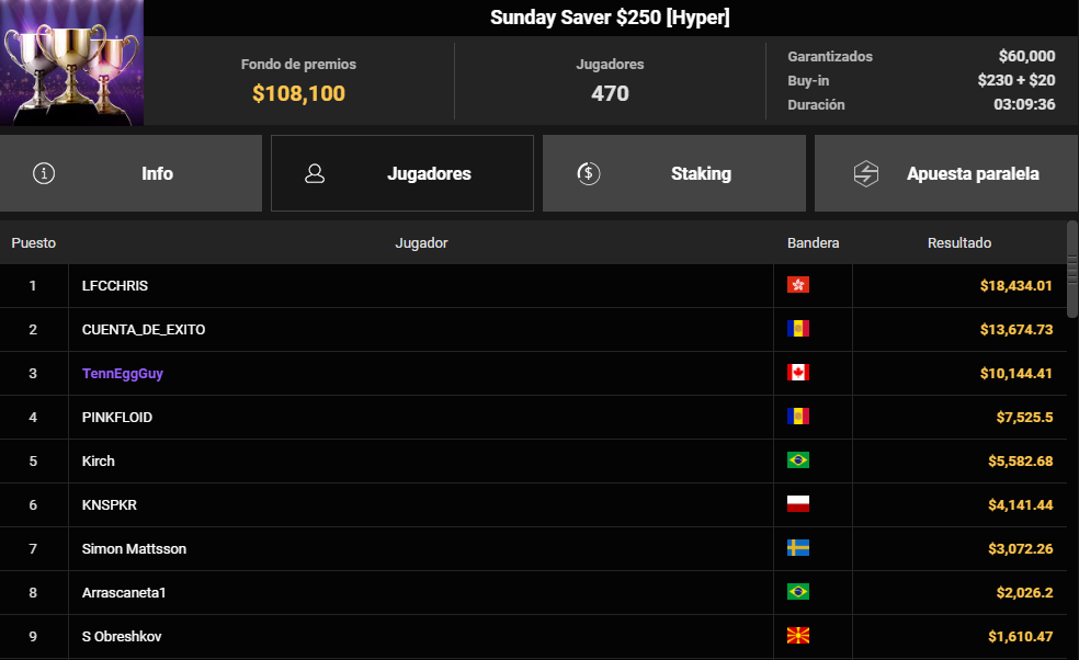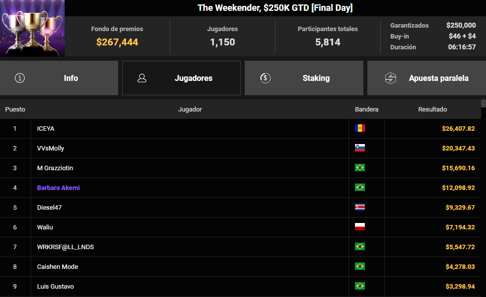 A continuación, el foco se desplaza a ICEYA, un jugador que a día de hoy es anónimo pero que podría ser español, quien fue el vencedor del The Weekender $250K Gtd. Compitiendo bajo bandera andorrana, se impuso a un gigantesco field de 5.814 entradas para llevarse 26.408 $.