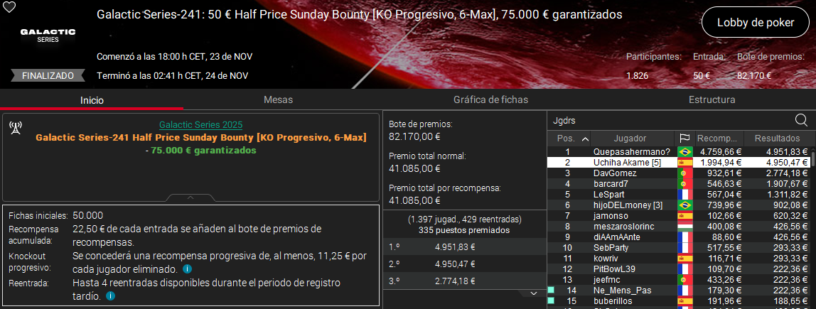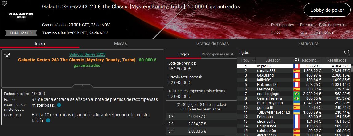 A estos dos resultados hay que sumar el conseguido por canalla888 en el Galactic Series-243: 20€ The Classic. El español se llevó un premio de 4.148 € gracias a un runner-up en este torneo de 3.627 participantes y 65.286 € de prize pool.
