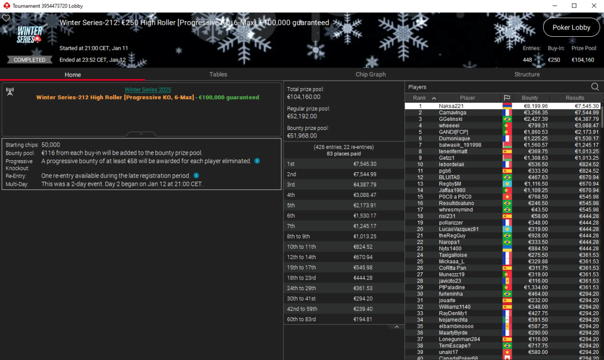 Si lo de k1dsstuff fue “el gran golpe”, lo de Naksa221 fue un triunfo de jerarquía. El €250 High Roller PKO 6-Max ya te obliga a ir con otra mentalidad: más presión, más regulares en las mesas y más spots complicados.