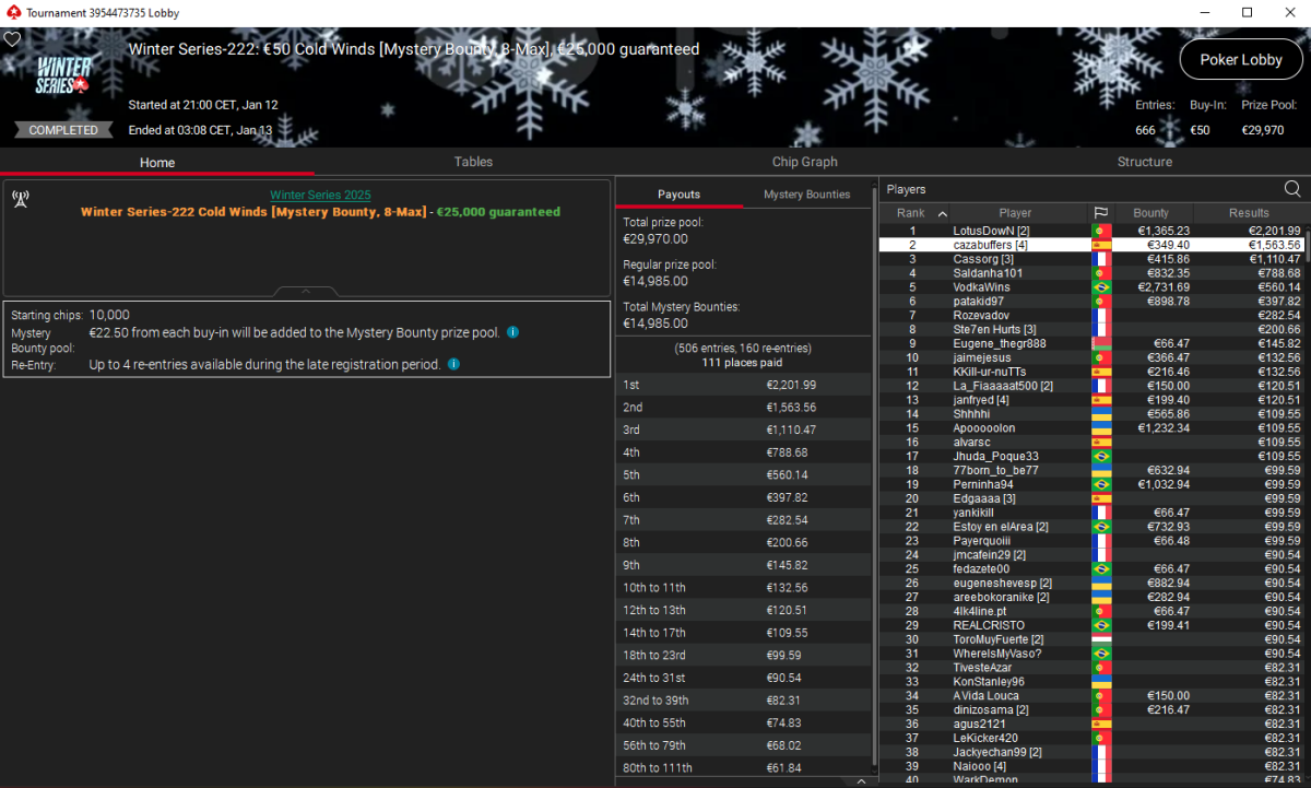 El €50 Cold Winds Mystery Bounty 8-Max dejó otra de las fotos más repetidas del día: un español a un paso de ganar. cazabuffers alcanzó el heads-up y terminó subcampeón por 1.913 €.