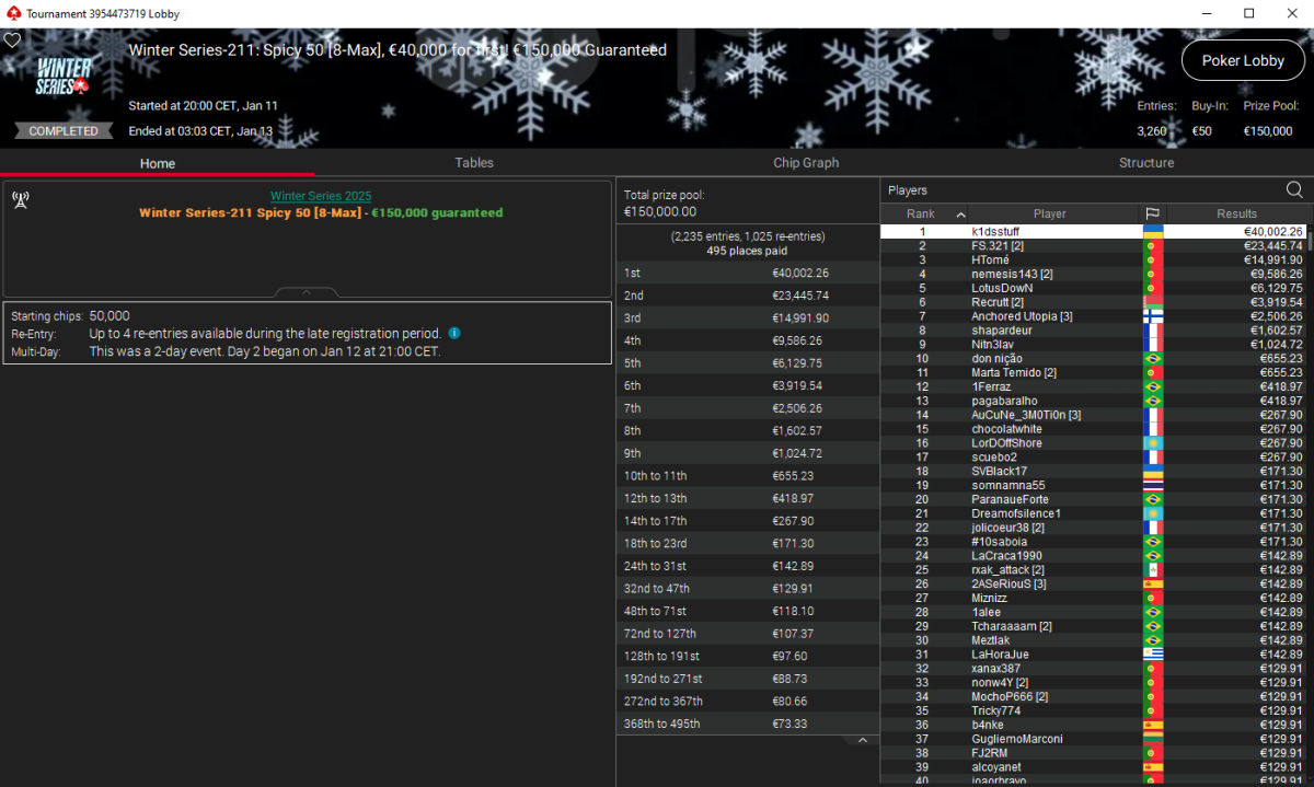 La historia, esta vez, se resume en una frase que por sí sola ya es titular: k1dsstuff convirtió 50 € en 40.002 €. A partir de ahí, Portugal fue la gran protagonista. Cuatro lusos quedaron por detrás del ucraniano, aunque sus premios fueron mucho menores. FS.321 se llevó 23.446 € tras caer derrotado en el heads-up, HTomé firmó un tercero que le reportó 14.992 €, mientras que nemesis143 y LotusDowN fueron cuarto y quinto respectivamente y se quedaron a las puertas de las cinco cifras.