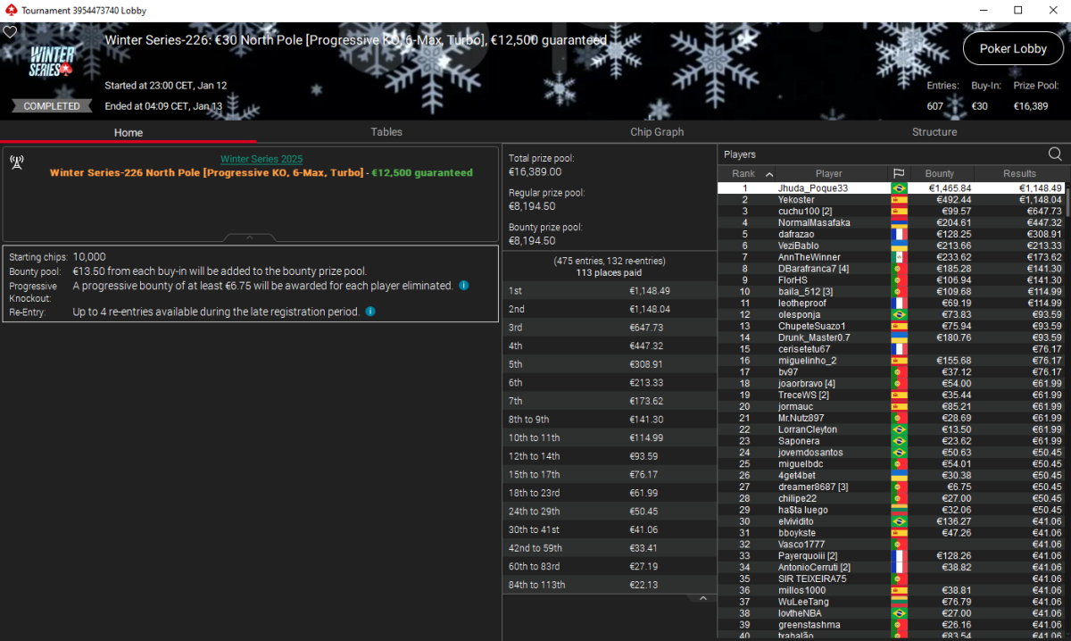 Si hay un torneo que muestra bien la naturaleza de los PKO turbos es el €30 North Pole 6-Max. Ahí, en ese escenario, el brasileño Jhuda_Poque33 se enfrentó a dos españoles en el 3-handed y los trituró. Yekoster se quedó a un paso del título con la segunda plaza y 1.640 € y cuchu100 completó el podio para llevarse 747 €.