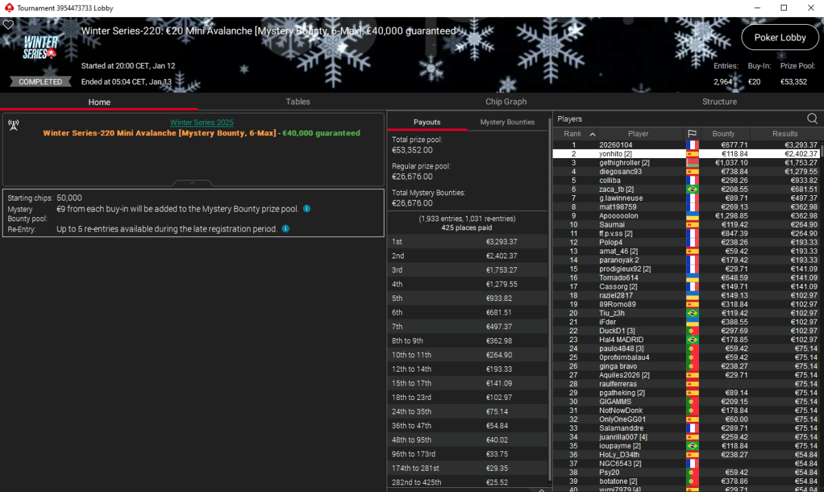 El €20 Mini Avalanche Mystery Bounty 6-Max volvió a ser un déjà vu: yonhito fue segundo tras caer contra otro francés y se hizo con 2.521 €, mientras diegosanc93 terminó cuarto por 2.018 €.