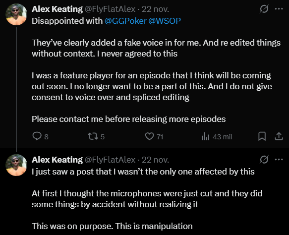 Poco después, Alex Keating, otro jugador que comparte apellido con Alan pero no parentesco, aseguró haber detectado también una voz falsa en su episodio, además de un montaje que “sacaba declaraciones de contexto”. Ambos jugadores denunciaron que, pese a no recibir compensación económica por aparecer en la serie, se les estaba utilizando para construir una narrativa artificial.