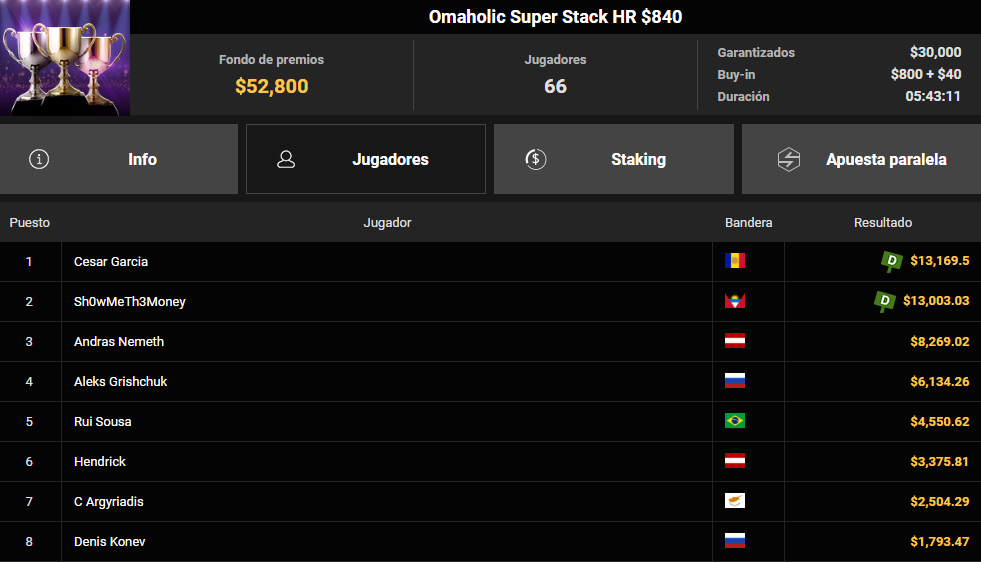 El tercer mayor premio de este bloque lo firmó César García, que volvió a lucirse en su terreno favorito: el Pot Limit Omaha. Se llevó el Omaholic Super Stack HR $840 por $13.170, en una mesa final donde manejó los tiempos a su antojo hasta llegar al heads-up, donde pactó con "Sh0wMeTh3Money", quien se llevó 13.003 $.