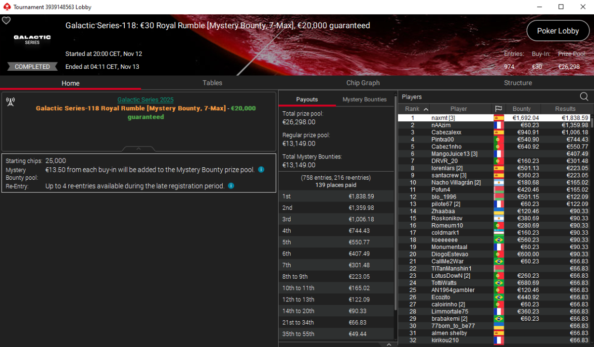 El tercer estandarte lo ondeó naxmt, triunfador del GS-118: €30 Royal Rumble [Mystery Bounty, 7-Max], donde superó a 974 jugadores y se llevó un premio regular de €1.839. Su botín se infló con €1.692 en sobres misteriosos, alcanzando un total de €3.531.