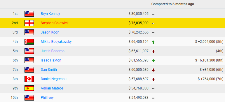 Méritos, desde luego, no le faltan. Chidwick presume de dos brazaletes de las WSOP, 12 títulos del PokerGO Tour (PGT) y tres victorias en Triton. En la clasificación histórica de premios en vivo figura segundo, solo por detrás de Bryn Kenney, que el mes pasado se convirtió en el primer jugador en superar los $80M en cobros. Chidwick va a la caza del americano y, actualmente, está a unos $4M de alcanzarle.