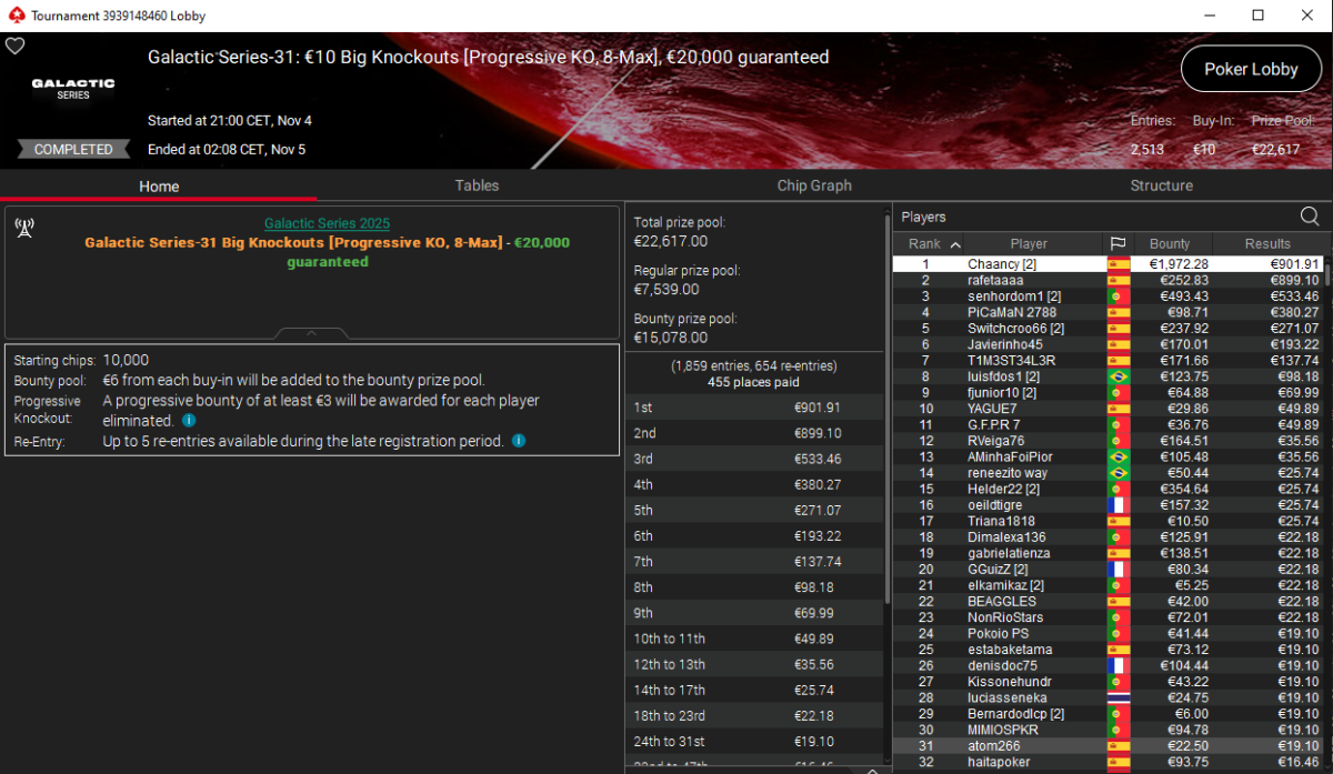 Chaancy fue otro de los grandes protagonistas al conquistar el Galactic Series-31: €10 Big Knockouts [Progressive KO, 8-Max], torneo con 2.513 registros y un premio de 2.874 € tras ser el gran protagonista en cuanto a eliminaciones se refiere.