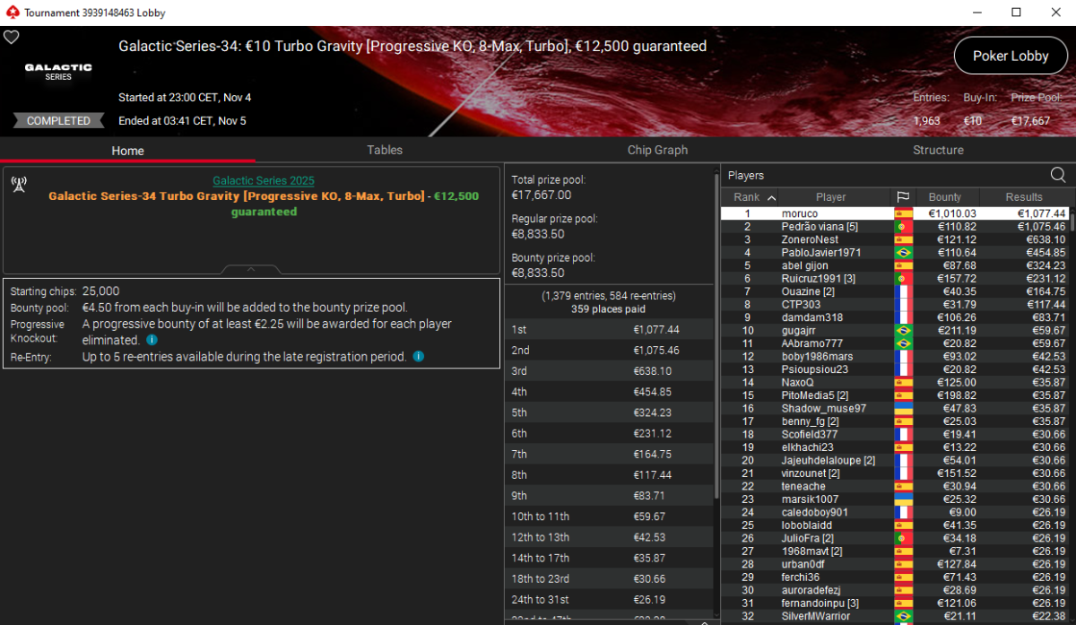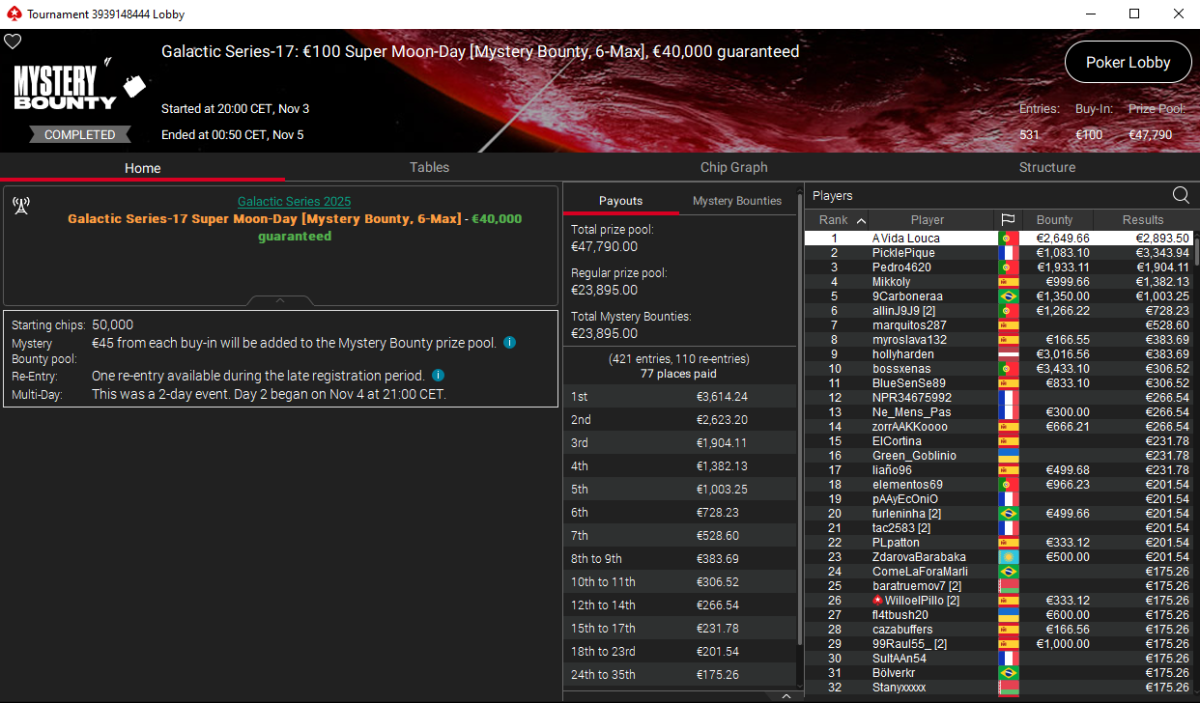 Mientras tanto, el portugués A Vida Louca firmó el segundo mayor cobro al imponerse en el Galactic Series-17: €100 Super Moon-Day [Mystery Bounty, 6-Max] con un botín total de 5.543 € gracias a los 2.650 € conseguidos en bounties.