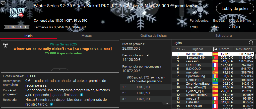 La victoria más importante se produjo en el Daily Kickoff PKO, un torneo de 20 € de entrada en el que 1.208 jugadores se midieron durante casi siete horas. Fueron 215 los que lograron entrar en premios, pero solo tiviskanders logró subirse a lo más alto del podio para hacerse con un premio de 3.530 € tras vencer al portugués Santana 1919 en el HU.
