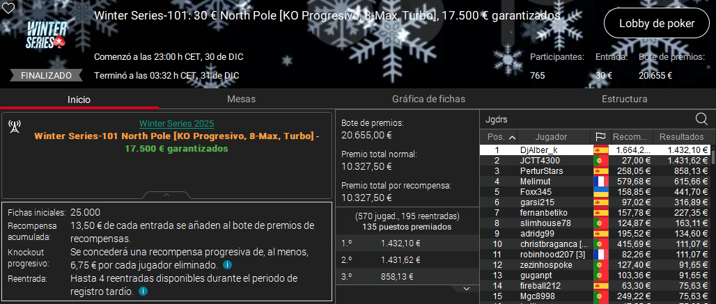 La cuarta y última victoria vino de la mano de DjAlvber_k gracias a un triunfo en el North Pole de 30 € de entrada.