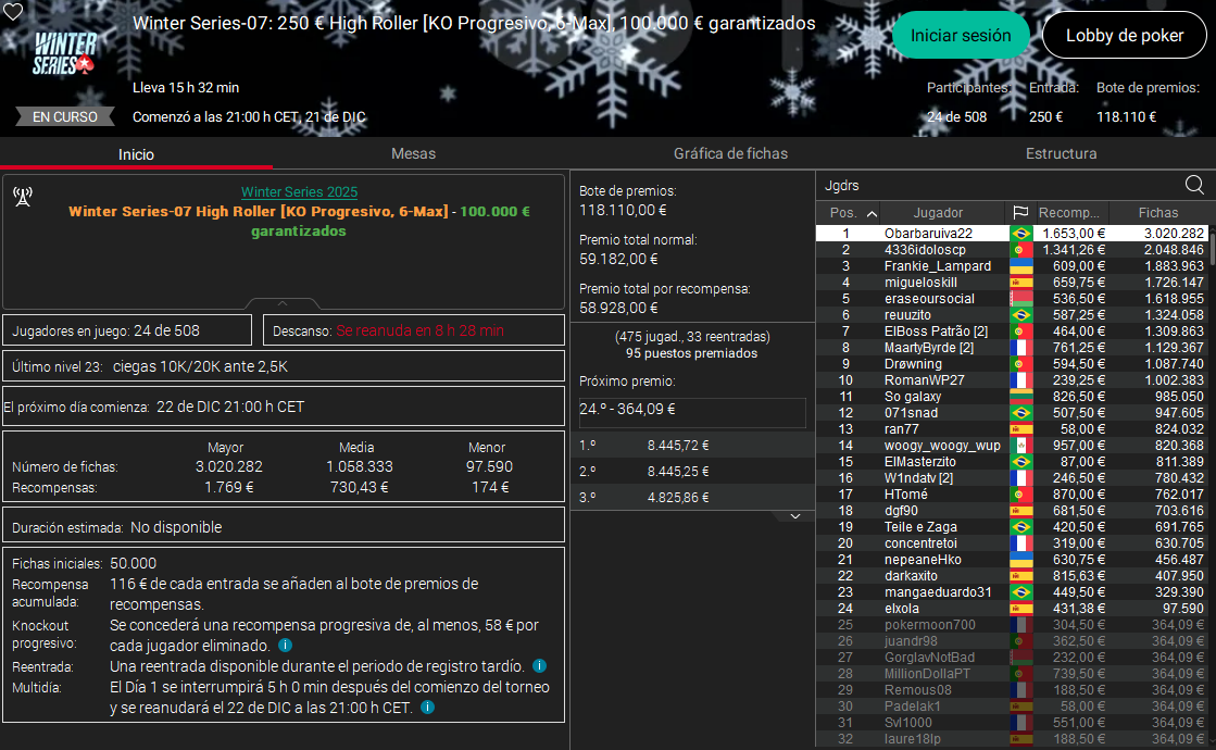 La Navidad no empieza hasta que empiezan las Winter Series y estas dieron comienzo ayer en la sala de la pica roja celebrando los 10 primeros torneos de un total de 297 que se celebrarán hasta el 19 de enero.