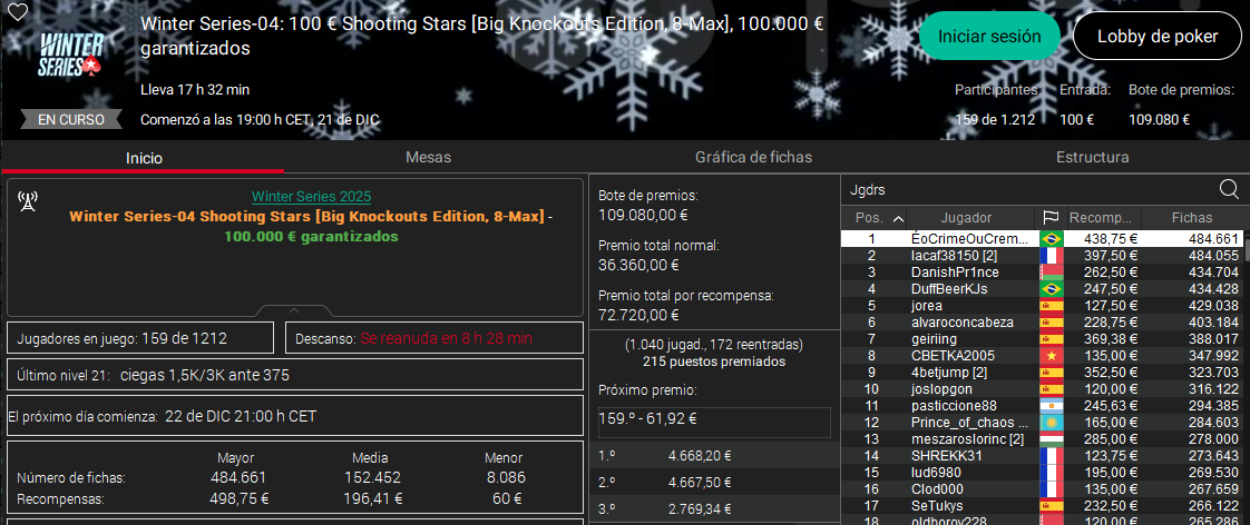 Otro de los torneos que quedó por concluir fue el Shooting Stars de 100 € de entrada. Pero en este todavía quedan con vida 159 jugadores de los 1.212 que se registarron ayer y hay mucha tela por cortar todavía. El ganador se llevará 4.668 € más los bounties, por lo que saldrá de este torneo rozando las 5 cifras.