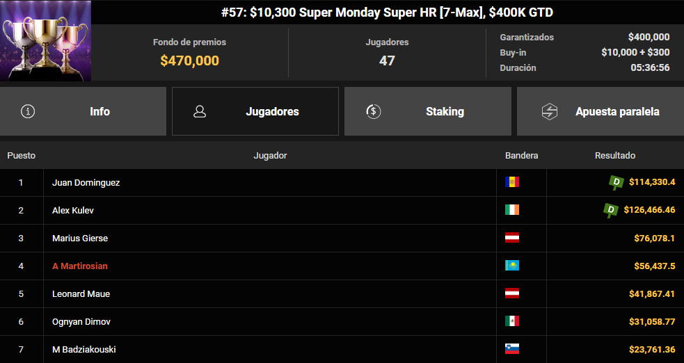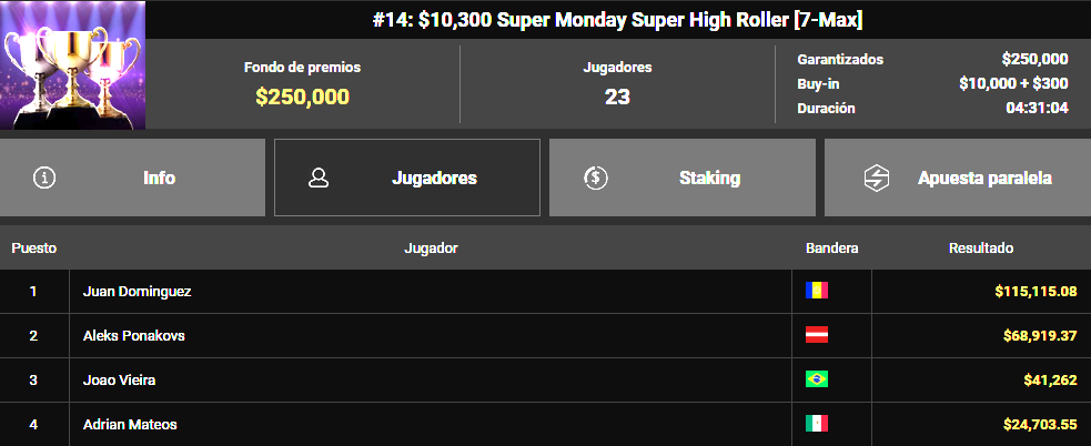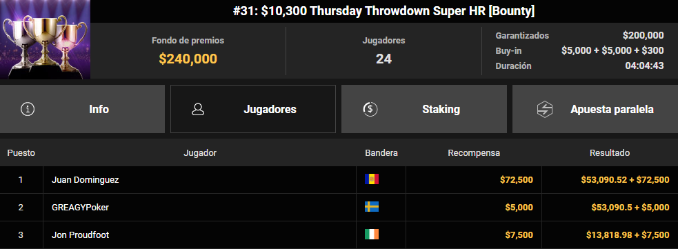 El malagueño se impuso en un field de 24 jugadores que premiaba a los tres mejores. En premios estuvieron Jon Proudfoot y 'GREAGYPoker', al que derrotó en el cara a cara para llevarse 53.091 $ de premio y 72.500 $ en recompensas para un total de 125.591 $.