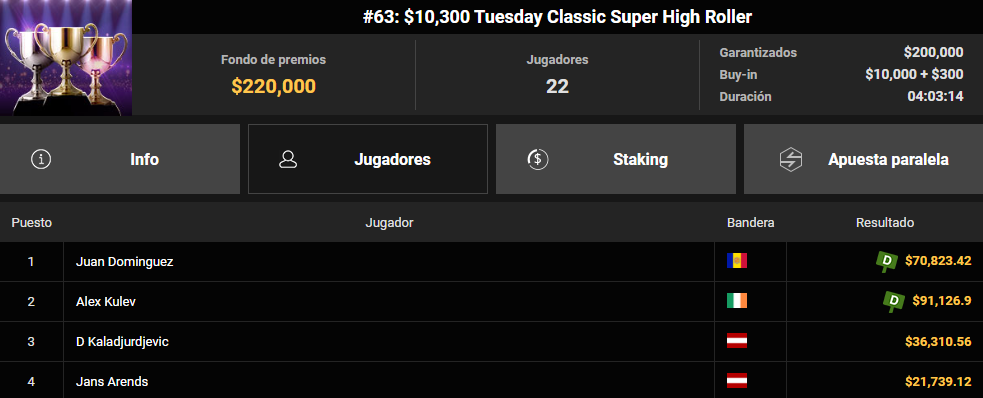 En el Tuesday Classic Super High Roller, con solo 22 jugadores, volvió a iluminarse su nombre en lo más alto de la tabla clasificatoria. Se llevó el torneo por 70.823 $ repitiendo el mismo patrón que en el anterior, pactando contra Alex Kulev cuando empezaba por detrás y volviendo a remontarle para dejarle claro que deberá hacer mucho más si quiere derrotarle.