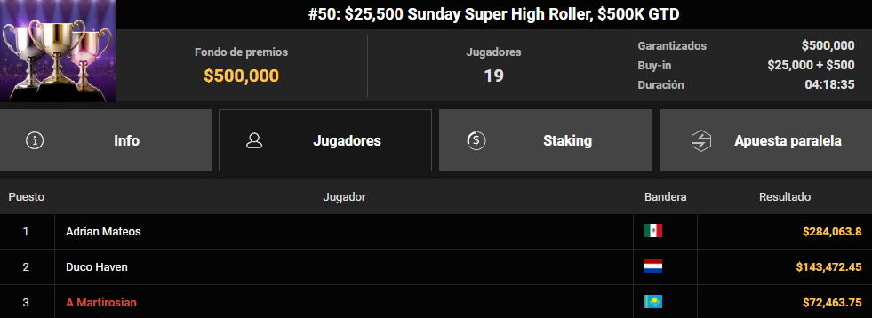 Mientras Malaka destrozaba los 10k, Adrián Mateos aprovechó para volver a salir en las portadas con un pinchazo en el 25.000 $, donde terminó imponiéndose en un field de 19 jugadores para llevarse 284.064 $.