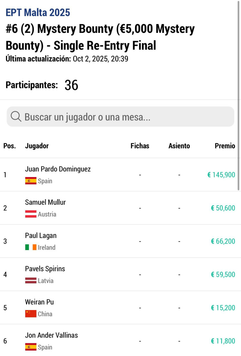 La mesa final tuvo también a otro español, Jon Ander Vallinas. El jacetano fue el primer eliminado una vez entraron en premios y se llevó 11.800 € como consolación. Juan, por contra, manejó el tempo como un director de orquesta y fue despidiendo uno a uno Weiran Pu, Pavels Spirins, Paul Lagan y Samuel Mullur, al que derrotó en el heads-up para hacerse con los 58.400 € del primer puesto.