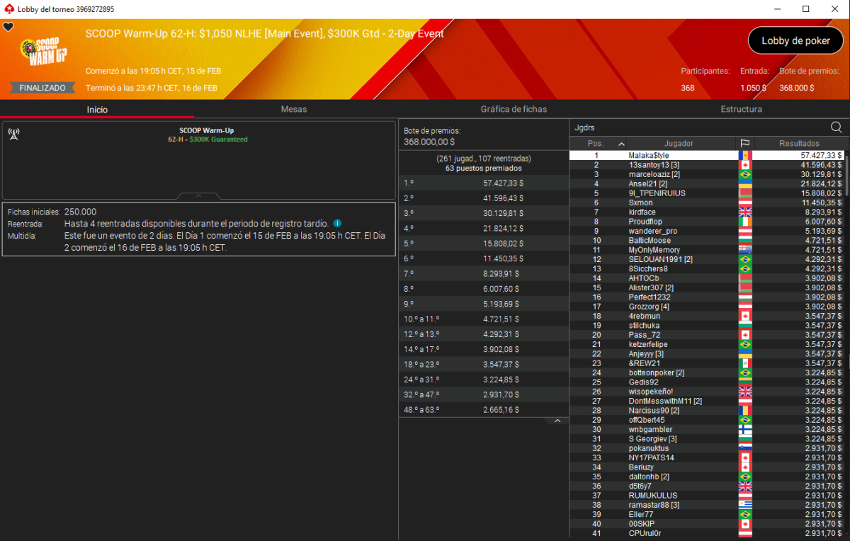 Juan Pardo ‘Malaka$tyle’ fue el gran protagonista al imponerse en el SCOOP Warm-Up 62-H: $1.050 NLHE [Main Event], un evento de dos días que reunió 368 entradas y elevó el prize pool hasta los 368.000 $. El malagueño se abrió paso hasta lo más alto del podio para embolsarse 57.427 $, culminando otra actuación autoritaria en los torneos grandes de PokerStars.