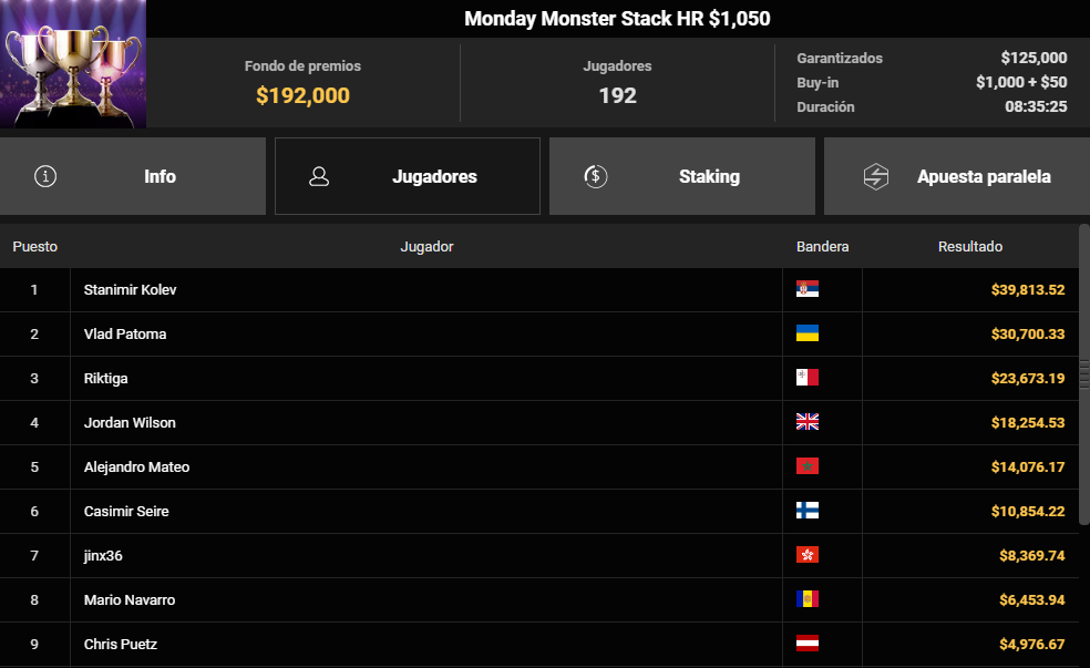La segunda alegría llegó en GGPoker, donde Alejandro Mateo -nombre tras el que se esconde Alejandro César Ganivet- firmó una quinta posición en el Monday Monster Stack HR $1.050. El torneo congregó a 192 jugadores y repartió 192.000 $ en premios, superando ampliamente los 125.000 $ garantizados.