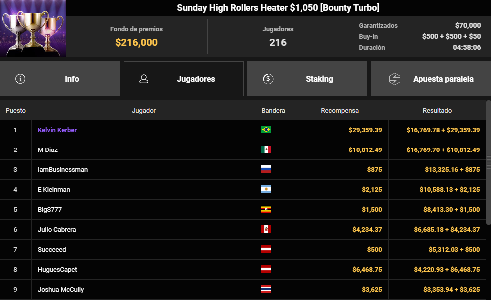 Buen resultado para la armada en el Sunday High Rollers Heater $1.050 [Bounty Turbo]: Mario Díaz se quedó a las puertas del triunfo con un 2º puesto en un torneo que reunió 216 jugadores y repartió un prize pool de $216.000, muy por encima de los $70.000 garantizados.