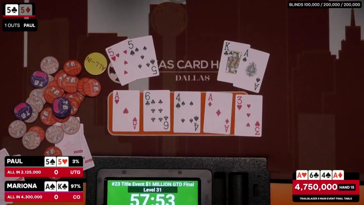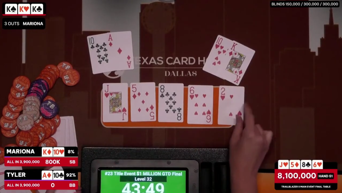 Con cinco jugadores en liza, llegó la mano que dejó fuera Mariona. La catalana se jugó su torneo con  KhTd desde la SB, pero se topó con el  AdTc de Tyler Rawlinson en la BB. No hubo milagro para Mariona, que se quedó con apenas 3bbs que ya no pudo remar. Eso sí, se marchó con la cabeza bien alta y con un premio de 52.010 $ en su bolsillo.