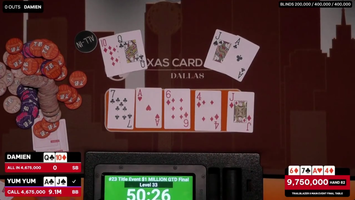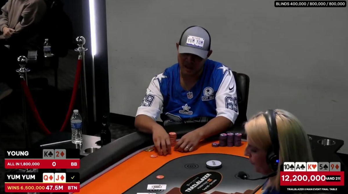 Ambos acordaron un pacto y se repartieron el dinero, dejando el trofeo en juego. Con 185.535 $ asegurados para "Yum Yum" y 160.535 $ para Young llegó el desenlace del heads-up. En la última mano del torneo, "Yum Yum" flopeó las nuts con  QdJd y stakeó a Young, que muy cortito le pagó las tres calles con  Kc2h en un board  TsAcKs5s9d.