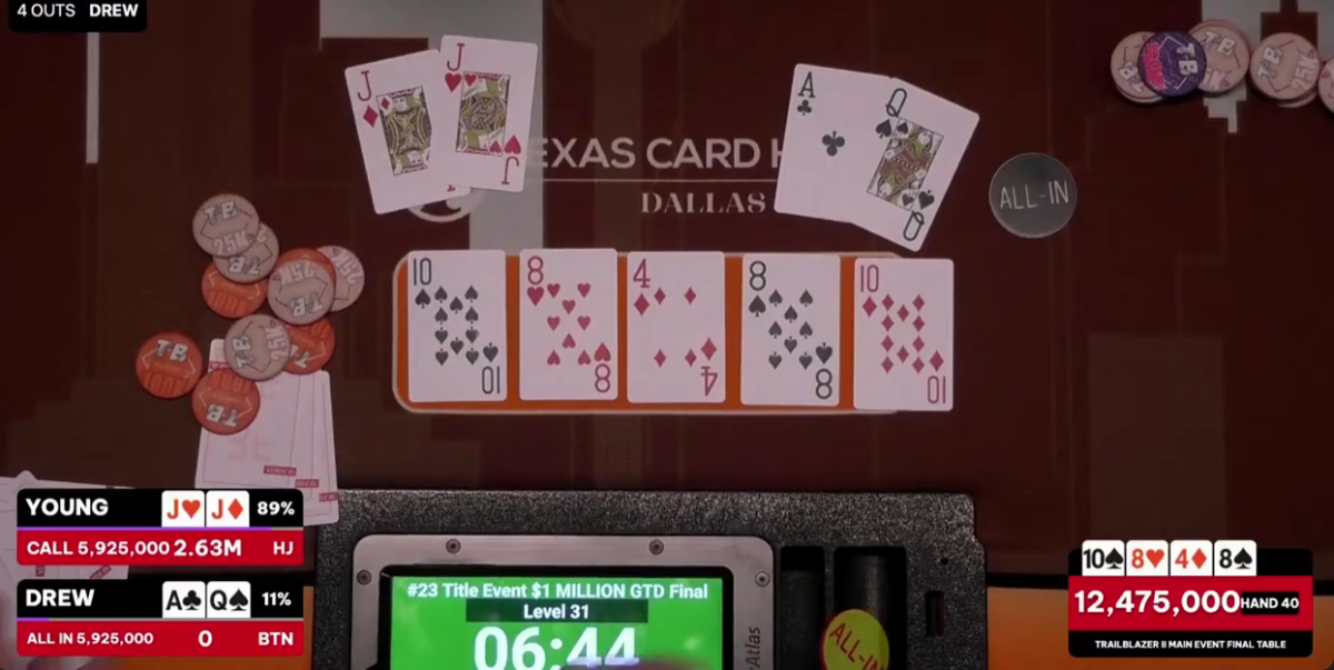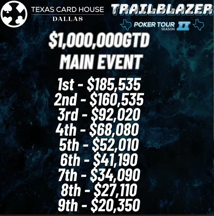 El Title Event del Trailblazer Poker Tour, disputado en el Texas Card House de Dallas, garantizaba 1 millón de dólares, pero gracias a las 1.193 entradas el prize pool se elevó hasta 1.252.650 $.