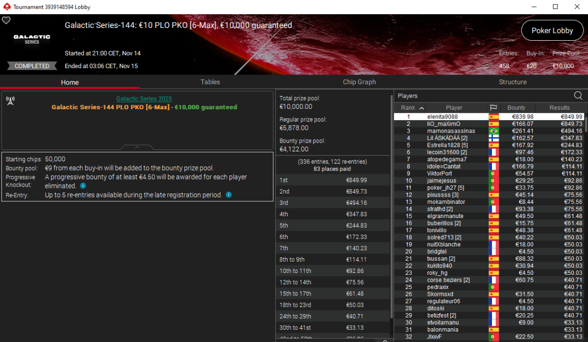 La corriente se intensificó cuando elenita9088 tomó el control del GS-144 PLO PKO €10, donde reventó escudos ajenos hasta acumular 850 € de premio + €840 € en recompensas por eliminaciones, totalizando 1.690 € en una batalla de 4 cartas en la que elenita9088 impidió el doblete de liO_maXimO.