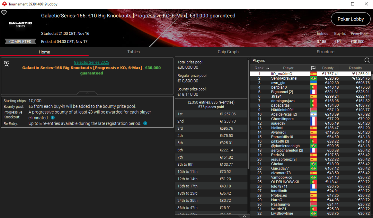 En el gigantesco GS-166 Big Knockouts €10, lio_maXimO fue el comandante que sobrevivió a la lluvia de naves enemigas: se llevó 1.256 € + 1.767 €, dejando el marcador final en 3.023 €, el cuarto pinchazo más gordo del fin de semana para la armada.