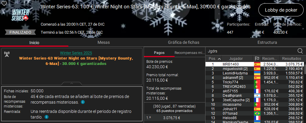 Esta fue la única victoria española en la sesión dominical, pero no la única importante durante el fin de semana ya que MRB1460 ganó el sábado el Winter Night on Stars de 100 € de entrada por 5.580 €.