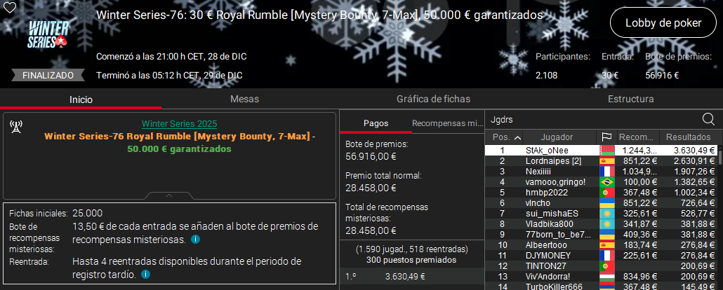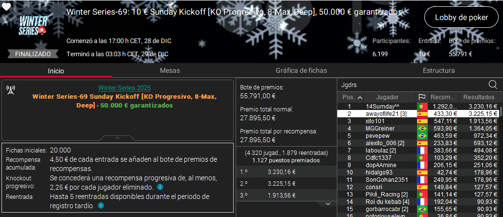 Ayer se disputó la última sesión dominical del 2025 y en PokerStars coincidió con la celebración de las Winter Series, un festival que ha vuelto a dejar una gran victoria para la armada en el Sunday Kickoff.