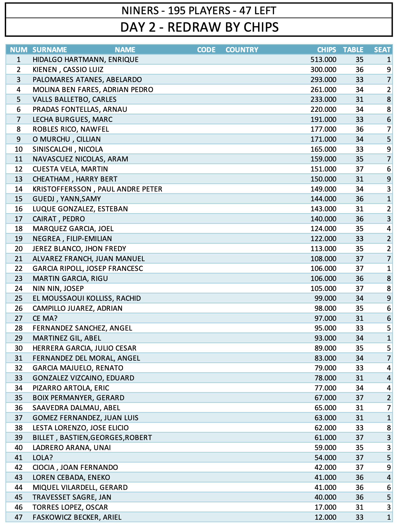 El Niners, torneo inaugural del festival con un buy-in de 200 €, regresaba a escena con los 47 jugadores que habían logrado su clasificación en el Día 1, disputado el martes, a partir de un total de 195 registros.