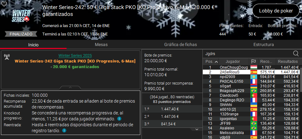 Ayer las Winter Series tuvieron un claro protagonista y ese fue 2ASeRiouS. El español se quedó muy cerca de firmar un doblete en la msma jornada, pero el jugador húngaro OneChougDoug impidió su victoria en el Giga Stack Pro de 50 € de entrada.